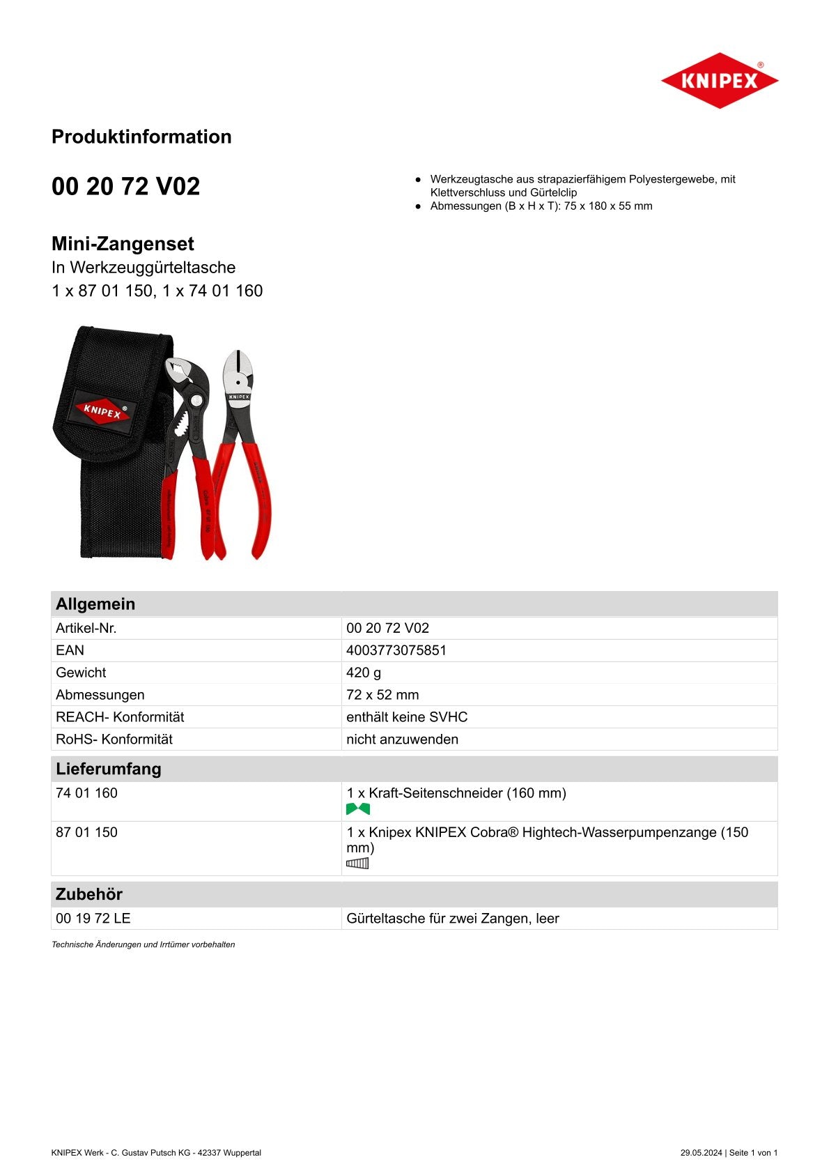 Der KNIPEX Zangensatz enthält zwei hochwertige Werkzeuge, die in einer robusten Gürteltasche aus strapazierfähigem Polyester-Gewebe sicher verstaut sind. Die Griffe sind mit einem Kunststoffüberzug versehen, der für eine sichere und komfortable Handhabung sorgt. Im Set sind ein Kraftseitenschneider (Art.-Nr. 4000 810 135) und eine Wasserpumpenzange (Art.-Nr. 4000 810 697) enthalten, die dank ihres geringen Gewichts von nur 390 g ideal für den mobilen Einsatz sind. Die Tasche verfügt über einen praktischen Klettverschluss und eine Gürtelschlaufe, was schnellen Zugriff und komfortables Tragen ermöglicht. So ist der Zangensatz perfekt für professionelle Anwender, die Wert auf Qualität und Flexibilität legen.